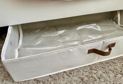 [This review was collected as part of a promotion.] These are roomy, well made underbed storage bins. They are cream colored with brown accents. You can even add a label to the little pocket in front. The best part is the transparent lid that allows you to see what's inside since you'll probably forget what you put in it in the first place lol.