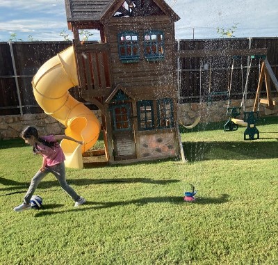 My kiddos were crying They wanted a summer fun day, I decided to go to target and luckily I stumbled upon this amazing hose Sprinker. Gives the perfect amount of water does not waste to much water we love it