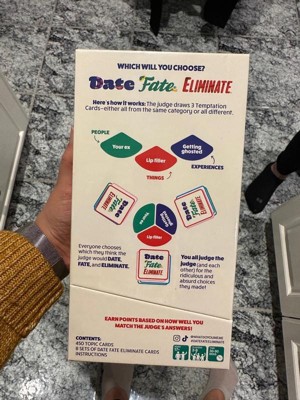 - The judge draws three Temptation cards — either all from the same category or all different. Now everyone chooses which they think the judge will DATE, FATE, and ELIMINATE by laying their cards down accordingly. Then the judge announces their picks — score a point for every one you guessed correctly!