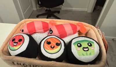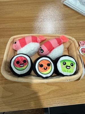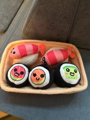 [This review was collected as part of a promotion.] These plushies sushi tray are the cuties. There are 3 sushi rolls and 2 sashimi rolls. These plushies are good quality as well as the plush tray. My children love to play and pretend to eat as if they are real sushi. They are soft to touch and good size. They are safe and reliable toy.