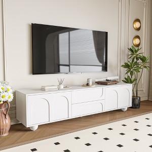 Bring style and functionality to your living room with this 69.6” TV cabinet, featuring a timeless and elegant arched panels that create a refined, modern look. Supported by five sturdy, ball-shaped iron legs, this stand ensures lasting stability and can easily hold TVs up to 75 inches. Two spacious cabinets and two drawers offer flexible storage for media devices, games, or accessories, while the wide tabletop provides ample display space. Each door and drawer is fitted with a rebound device for smooth, handle-free opening—just press to access your items, maintaining a clean, streamlined appearance. Soft-close hinges deliver quiet, gentle operation for everyday use. Designed for both durability and sophistication, this TV cabinet is the perfect centerpiece for any contemporary home.