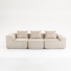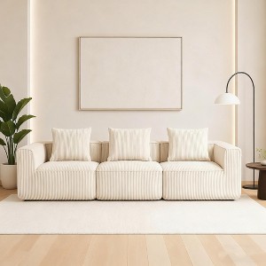 This multi-person modular compression sofa offers flexible free combination to suit various space needs. Upholstered in soft, durable corduroy fabric with vertical ribbed texture, it provides a sophisticated look and cozy feel while being easy to maintain. The modern all-compressed design delivers a minimalist aesthetic that blends seamlessly into different interiors. Delivered vacuum-sealed with no assembly required—simply unbox and allow up to 72 hours for cushions to expand fully. The corner unit features a distinctive horizontal texture and varied armrest heights, creating a unique visual contrast with other modules.