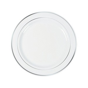 White Plastic Dinner Plates with Silver Trim - 25 Ct.