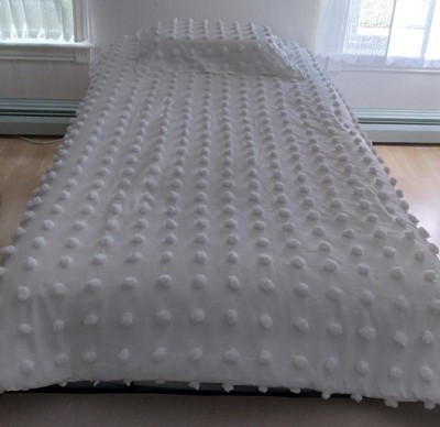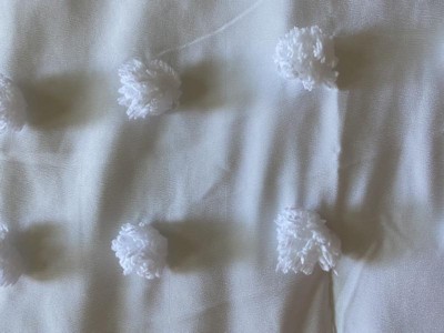 [This review was collected as part of a promotion.] This soft, pretty comforter is the kind of bedding that updates the look of my entire bedroom. The bright white-on-white fabric with whimsical pom poms is such a clean look, and this set is beautifully made. I was worried that the pom poms would come off but they’re securely fastened and add such a pretty texture. I washed the comforter and pillow case and they came out of the wash fluffy and perfect. Note: the comforter and sham feel like cotton but are actually made of 100% polyester fabric; the front is slightly textured, and the back is silky smooth. The comforter is stuffed with 100% polyester filler, which is lightweight and warm. I love that the comforter comes with a matching pillow sham, which ties everything together. Wonderful design and quality workmanship!