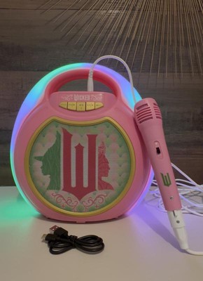 This is the worst! We are a musical theater family and the little kids have every Disney musical singing mic and karaoke machine that exists. This one seemed like a step up from those but it hardly compares. At a $50 price point, there should be a way to turn the reverb on the mic OFF. It is on full and can’t be changed. The next song and volume button are the same button… the volume is way too loud and the sound quality is terrible. The lights don’t react to the sound, they just flash pink or green. It’s so bad. And on top of all that, for $50 you don’t even get preloaded clips of wicked music. This is just a terribly overpriced, poor quality Bluetooth speaker. With so many great examples of branded karaoke toys out there, I can’t believe how hard they missed on this one. What a disappointment. Returned.