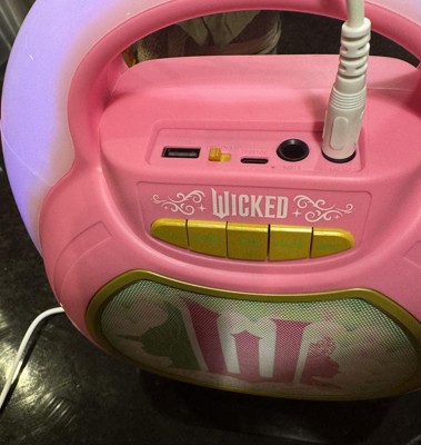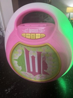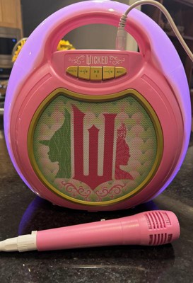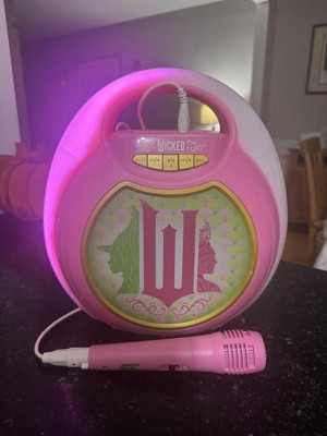 This is the worst! We are a musical theater family and the little kids have every Disney musical singing mic and karaoke machine that exists. This one seemed like a step up from those but it hardly compares. At a $50 price point, there should be a way to turn the reverb on the mic OFF. It is on full and can’t be changed. The next song and volume button are the same button… the volume is way too loud and the sound quality is terrible. The lights don’t react to the sound, they just flash pink or green. It’s so bad. And on top of all that, for $50 you don’t even get preloaded clips of wicked music. This is just a terribly overpriced, poor quality Bluetooth speaker. With so many great examples of branded karaoke toys out there, I can’t believe how hard they missed on this one. What a disappointment. Returned.