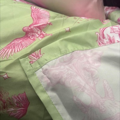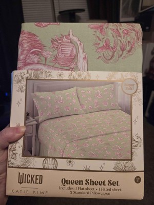 I am so excited to have these storybook illustrated Wicked sheets. They are so soft, with vibrant pink and green tones. I received 2 Standard Size Pillow Cases, 1 Fitted Sheet, and 1 Flat Sheet. There was no 'factory' smell that came with the fabric; I could have probably gotten away with immediate use, but definitely waited to launder the set first. Laundry instructions are simple and easy to read on both the tags and the back of the box the sheets come in. The stitches and seams are well made, with no hanging threads or imperfections in the stitches. These sheets will definitely take you away in a dreamy bubble, and let you defy gravity through the night.