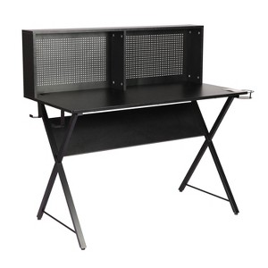 Transform your work-study area and organize your space with the Wilmore Desk from Buylateral. A moderate height hutch is designed with a perforated modesty panel for minimizing distractions, along with a top shelf for storing books, binders, and more. The featured drink holder and side hook assist in clearing desk clutter, maximizing your work surface. While the unique pegboard back panel allows for organization and creativity. This ideal workstation in a black finish is constructed of durable laminated MDF and a metal frame with cross bars and a back panel for added support.