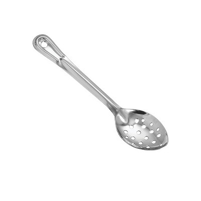 Ideal for removing select food items from a large pot the Winco BSPT-15 Perforated Stainless Steel Basting Spoon 15" will ensure fast drainage of unwanted liquids. Constructed with carefully placed perforations to facilitate quick drainage, this 1.2mm thick stainless steel basting spoon is durable enough for tough commercial use. With a long handle this basting spoon offers easy access into deep pots while its convenient hang hole makes it easy to store.