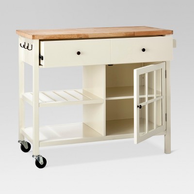 Give your kitchen a contemporary feel while you stay organized with the Windham Wood Top Kitchen Island from Threshold. This kitchen island makes for a great way to keep everything you use the most right at your side - with one towel bar, one drawer, three hooks and four shelves, you'll have your essentials right where they should be while you prep meals or entertain guests. With the convenience of caster wheels, you can move the cart anywhere you'd like without having it take away from the rest of your kitchen decor. Recommend two people for assembly. Expect around one hour for assembly with clear directions.