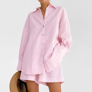 Woman Solid Shorts Set – Casual Fit Long-Sleeve Lapel Shirt & Shorts, Cotton Lined Cherie Code
