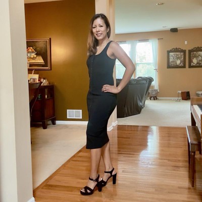 Buy this cute black dress! Material is stretchier and thicker than you think. It’s a heavier fabric and the ribbed material hides imperfections. Best part about this dress is that most of the buttons are fake! Only the top 2-3 buttons and last 3-4 buttons are functional. I like this feature especially when sitting or bending because those little spaces won’t open up.