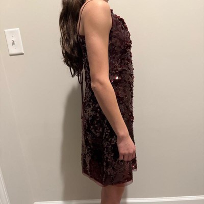 [This review was collected as part of a promotion.] I purchased this women's evening dress in store. This beautiful cocktail dress looks a lot more expensive than it actually is. This would make a wonderful new year's eve party dress, or a fancy Christmas party dress. The deep berry color is gorgeous and the sequins really shimmer. I like the drapey plunge neck and the criss cross back. It is pretty short, but for an evening out I think it's ok. I'm wearing a size small and I would say that it fits true to size. I usuawear a 2-4 in dresses. I'm 5'4" and weigh approximately 125 lbs. Again, the price was very affordable for the style and quality.