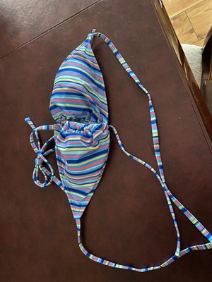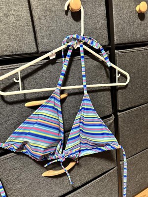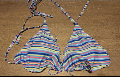 Tricot triangle bikini top from Wild Fable™ with a tie-front accent. Adorned with a multi-striped print on a light blue backdrop. Made from nylon fabric with spandex and full lining for flexible comfort in and out of the water. Halter-neck design with back and behind-neck ties offers a secure fit. Removable cups provide customizable coverage.