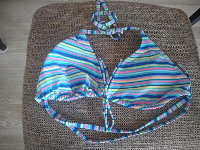 Wild fables XL women's tie-front triangled bikini top is a very cute multi striped blue top. You can literally match this bikini top with any solid color bikini bottom. This bikini ties around the back of neck and one tie around your back with plenty of extra room. The triangled top fits perfectly. True to size. Padded for extra comfort (and privacy). There's also a cute little tie in the middle of the bikini. This bikini is stitched very well, made to last. Very bright & colorful. Vibrant colors. Great quality. I would absolutely recommend Wild Fables bikini top. You'll be summer/ beach ready in style & comfort.