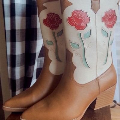 Spruce up your shoe collection with these Natalie Boots with Memory Foam Insole from Universal Thread™. These mid-calf faux-leather boots are designed in a two-tone silhouette featuring a tan vamp and a beige shaft adorned with red rose plus green leaf and stem motifs plus cutout and embroidered accents for a standout look. Featuring a 2.25-inch block heel and TPR outsole, these pointed closed-toe boots also have a memory foam insole, side zipper closure, curved notched topline and a pull loop, making them both functional and fashionable.