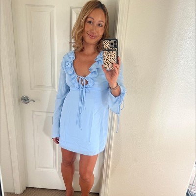 Crepe bodycon dress from Wild Fable™ in a solid shade with a mini length. Features a deep V-neckline with ruffle accents and tie detailing, bell long sleeves with trailing ties and a back-tie waist. Made from lightweight 100% recycled polyester with matching lining for comfortable wear. Full-length zippered back completes the sleek look.