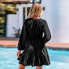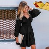 This black mini dress fuses vintage romance and modern flair. It has a deep V-neckline, long sleeves with elastic cuffs, smocked bodice for a flattering silhouette, and a tiered ruffled skirt. Lightweight and flowy, it works for cool weather outings. Perfect to dress up with heels or down with sneakers for a charming, breezy vibe. Product code: CAA05A5H049JJ