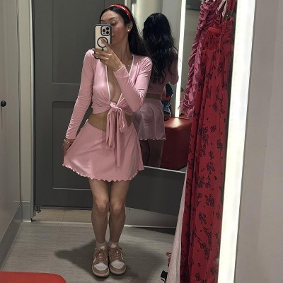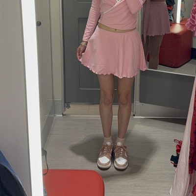 I love the fact that it’s a skort and it’s lightweight. The trimming gives it that extra cute girly look. I’m 5’3” and I think it’s a good length, not too short or too long; which is why I’ve added a photo with me bending my knees a little bit. Perfect for Valentine’s Day/Galentine’s and even spring time! However, the material is a little sweaty/warm for me. Still a cute and comfy skirt, especially when paired with the top!