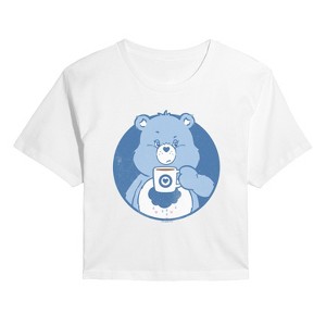 Care Bears - Grumpy Bear Coffee - Juniors Cropped Graphic T-Shirt - Share the love and show your caring side with Care Bears graphic apparel, featuring colorful designs inspired by the classic characters from the Kingdom of Caring. With favorites like Cheer Bear, Grumpy Bear, and Tenderheart Bear, each piece brings nostalgic charm, positivity, and heartwarming vibes to your wardrobe. Perfect for fans of all ages who believe in sharing kindness, friendship, and a little bit of magic wherever they go.