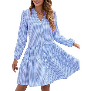 Women's Casual Plaid Dress Long Sleeve V Neck Button Down Short Dress Ruffle Swing Pleated Mini Dress - 1 of 4