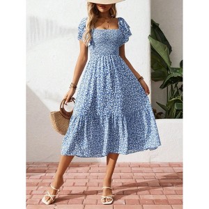 Women's Casual Summer Midi Dress Ruffle Short Sleeve Square Neck Smocked Tiered Ruffle Dresses