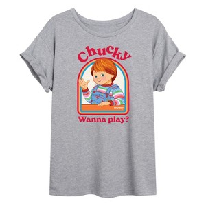 Chucky - Friendly, Wanna Play - Women's Oversized T-Shirt - Unleash the terror of a horror classic with Child’s Play graphic apparel, featuring chilling designs inspired by the infamous killer doll, Chucky. From his innocent beginnings to his most sinister moments, each piece captures the twisted humor and slasher thrills of the cult-favorite film. Perfect for horror fans who like their scares with a side of mischief, this collection brings the nightmare to life in bold, unforgettable style.