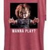 Chucky - Wanna Play - Womens Short Sleeve Graphic T-Shirt - Unleash the terror of a horror classic with Child’s Play graphic apparel, featuring chilling designs inspired by the infamous killer doll, Chucky. From his innocent beginnings to his most sinister moments, each piece captures the twisted humor and slasher thrills of the cult-favorite film. Perfect for horror fans who like their scares with a side of mischief, this collection brings the nightmare to life in bold, unforgettable style.