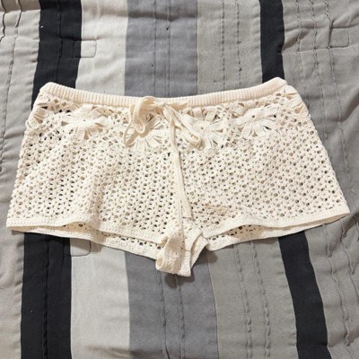 Crochet cover-up shorts from Wild Fable™ in a cream hue with an unlined, sheer construction. Tailored in a low-rise silhouette. Made of cotton-acrylic blend fabric for comfortable wear. Drawstring waistband completes the look and provides a personalized, stay-put fit.