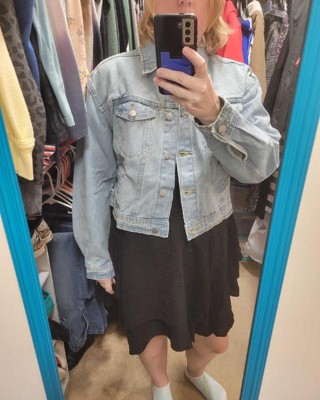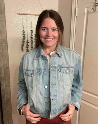 [This review was collected as part of a promotion.] I am wearing a size medium in this cropped jean jacket from Universal Thread. The jean material was a little on the thick side. The style was more of a relaxed fit so it seemed to be a little oversized. I felt like the arms were a little big on me. I would consider sizing down one size for a better fit. I received an incentive to write this review.