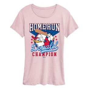 Disney - Home Run Donald - Women's Short Sleeve Graphic T-Shirt - Add a touch of magic to your wardrobe with this graphic apparel featuring iconic Disney designs. Showcasing beloved characters and classic imagery, each piece combines nostalgic charm with modern style—perfect for Disney fans of all ages. Whether you're headed to the parks or just adding whimsy to your everyday look, these graphics bring the magic to life.