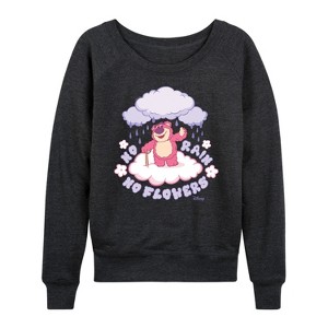Women's - Disney - Lotso No Rain No Flowers Lightweight French Terry Wide Neck Long Sleeve Graphic Shirt - 1 of 4