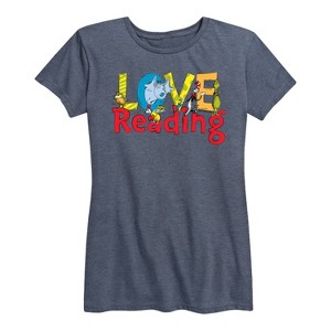 Dr. Seuss - The Cat In The Hat Book Cover Love Reading - Women's Short Sleeve Graphic T-Shirt - Our collection of graphic apparel featuring officially licensed Dr. Seuss characters brings the whimsy and wonder of Seussville straight into your wardrobe. From the mischievous Cat in the Hat to the stinky Grinch, each design showcases iconic characters and scenes from Dr. Seuss's timeless stories.