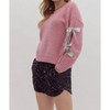 Wear this v-neck sweater with your favorite denim for the perfect fall look.This sweater features charming silver bows on its long sleeves and a wide V-neck trim for a touch of elegance. Made from 100% polyester, it offers a comfortable fit with a convenient pull-on closure. Perfect for adding a playful element to your ensemble, this solid-patterned V-neck is a standout piece for women.