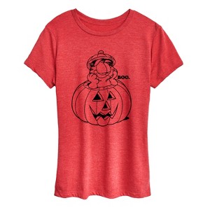 Garfield - Pumpkin Art - Women's Short Sleeve Graphic T-Shirt - Bring the humor and laziness of the famous orange cat to your wardrobe with Garfield graphic apparel. Featuring Garfield, Odie, and Jon, these designs celebrate the iconic comic strip and its beloved characters.