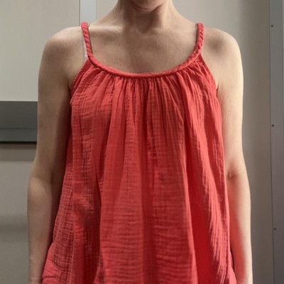 I really wanted a slightly oversized, drapey gauze top to wear in the hot summer months but also for fall with a cardigan over it. This top is exactly what I was looking for! I love the braided straps, the higher up arm holes and the a-line, swingy shape. It's cool and breezy and also flattering. Yes, it's relaxed, but I don't think that's a drawback. Size down if you want a closer fit, but this was flattering in my normal size, despite being loose and flowy. The only reason I'm not giving it a full five stars is that the first one I got ended up having to be returned as the bottom hem was unraveling. Not sure if I got a dud or if the quality isn't up to par. Having said that, washes and line dries great, no shrinkage and no unraveling so far on the second one!