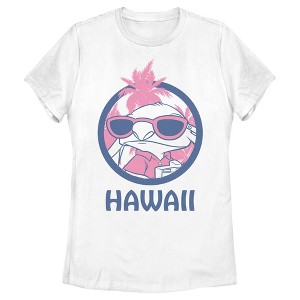 • Strut your stuff with this stylish new women's t-shirt that is perfect for every occasion! Featuring a dark blue circle with a cool Stitch wearing pink sunglasses and "Hawaii" written below him.