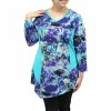 Discover the versatile charm of this tunic blouse, designed with both layering and standalone wear in mind. Its flattering silhouette and stylish details make it a closet essential.Beautiful tunic in shades of purples, aqua, white, and black. 3/4 sleeves. V-neckline. Asymmetrical hemline. Large bust 44" length 30". XL bust 46" length 30". 1X bust 48" length 31". 2X bust 52" length 31". 3X bust 56" length 31". One side hangs longer. 95% rayon, 5% Lycra. Machine washable cold, gentle cycle.