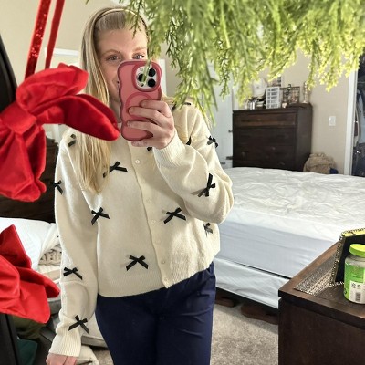 Loved it in store, thought about, went back the next day and bought. Tried it on and then saw the one of the bow placements on the left and said nope. I could’ve moved the bow slightly but I shouldn’t have to. Plus one of the bows fell off out of the bag so imagine trying to launder it. Disappointed as I had high expectations for this sweater. It is soft and true to size, although just a bit cropped.