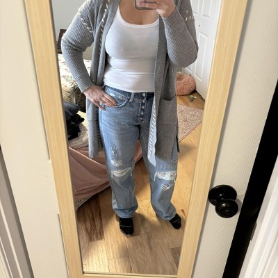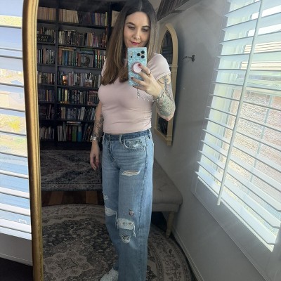 I love how these jeans look, they are super cute!! However, they have a “cheap” quality about them once you wear them for a few hours. The waistband does not have enough material to be supportive and sort of crumples, making it a bit of an uncomfortable fit. I felt like I kept pulling them up. Also, there’s a bit too much material in the seam of the crotch which makes it feel like there’s a lump in the jeans when you’re walking. I wanted to be happy with these for $45. I’m usually a 14 but got a 12 since they runs little big.