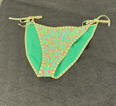 Green bikini bottom from Wild Fable™ features floral print and contrast binding for an elevated look. Tailored of recycled polyester-spandex blend fabric with four-way stretch and elastic at leg openings for flexible comfort all through your activities. Low-rise design with side ties offers a secure fit. Helps provide cheeky coverage.
