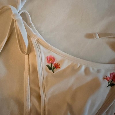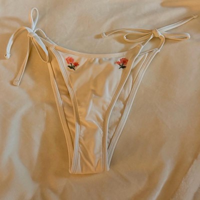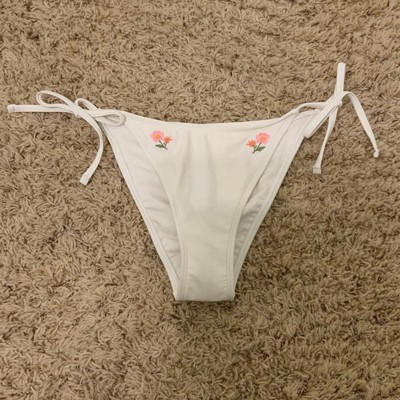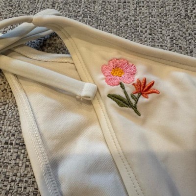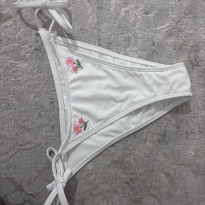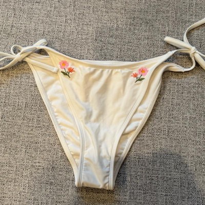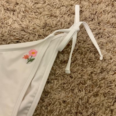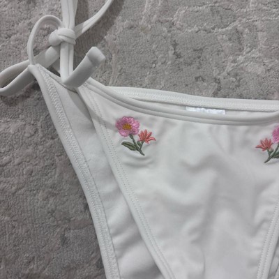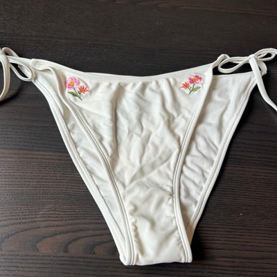String bikini bottom from Wild Fable™ adorned with embroidered multicolor flower motifs on a cream-color backdrop. Features side-tie fastenings to provide a personalized fit. Made from nylon fabric with spandex and full lining with 4-way stretch for flexible comfort in and out of the water. Extra-cheeky coverage and a low-rise, high-leg silhouette with elastic at leg openings finish off the chic look.