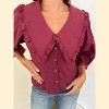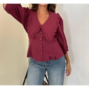 Pair this with your favorite jeans and slides for your next girls night out. Elevate your wardrobe with the Maggie Button Peasant Top by Sofie the Label, a chic and timeless blouse in crisp white. This piece features three-quarter length sleeves and a cropped length, highlighted by a charming scooped neckline with a ruffled Peter Pan collar. Crafted from a cotton blend with cotton, nylon, and spandex, it ensures a comfortable, flattering fit. This imported top is finished with a button closure and is best maintained by hand washing cold. Model is 5'4" and wears a size small.