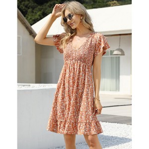 This casual summer boho mini maternity dress features with v neck, short sleeve, stretchy smocked bust, floral, loose fit, a line babydoll, mini length, knee length with ruffle hem, high waist, flowy swing, plus size. The smocked bust allows more room in bust and suits for various of bust sizes.