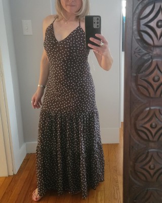 I bought this online without ever trying it on. what a surprise, I love it!! it's perfect for a tropical vacation or dinner or special event. but can also be casual with flip flops. I haven't figured out the bra situation yet. the material has stretch and I would say it is true to size. I'm 5'1" and 130 lbs, I bought a size small. it grazes the tops of my feet, if I were taller I may size up, so I don't have to hold in my tummy. but it fits perfectly as is. highly recommend. it is brown with blue dots which is a fun color combo