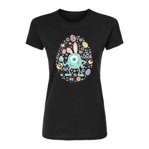 Monsters Inc - Mike Easter Egg - Juniors Fitted Graphic T-Shirt - Scare up some fun with Monsters, Inc. graphic apparel, showcasing Sulley, Mike Wazowski, and Boo in colorful designs from the beloved Pixar classic.