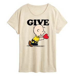 Peanuts - Give - Women's Short Sleeve Graphic T-Shirt - From the best-loved comic strip in history comes officially licensed PEANUTS apparel for fans everywhere. Show your love for Charlie Brown, Snoopy, Woodstock, Lucy, Linus, Pigpen and the whole gang. Copyright Peanuts.