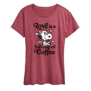 Peanuts - Love Is A Full Cup Of Coffee - Women's Short Sleeve Graphic T-Shirt - From the best-loved comic strip in history comes officially licensed PEANUTS apparel for fans everywhere. Show your love for Charlie Brown, Snoopy, Woodstock, Lucy, Linus, Pigpen and the whole gang. Copyright Peanuts.