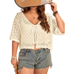 Women's Plus Size Crochet Cardigan Crop Short Sleeves Tie Front Lightweight Knitwear - 1 of 4