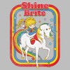 Head on down to Rainbow Land and bring back some fun and color to your life with exciting new officially licensed apparel for the whole family from the iconic 80's television series Rainbow Brite! This Women's Rainbow Brite Starlite Shine Brite Graphic T-Shirt features Rainbow Brite riding Starlite with the text: "Shine Brite," across the top. Darkness won't stand a chance when you rock one of these new Rainbow Brite designs!
